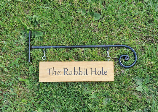 Personalised sign made from reclaimed wood with wrought iron wall bracket hanger