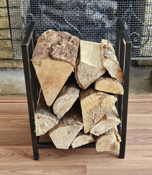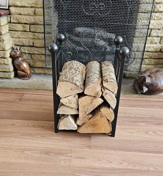 Traditional steel log store with twisted bar detailing. Handmade and crafted in the UK